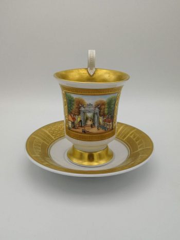 Der polychrom bemalter Blütenbesatz und das feine Handwerk stammt von der Dresdner Porzellanmanufaktur bei Potschappel.