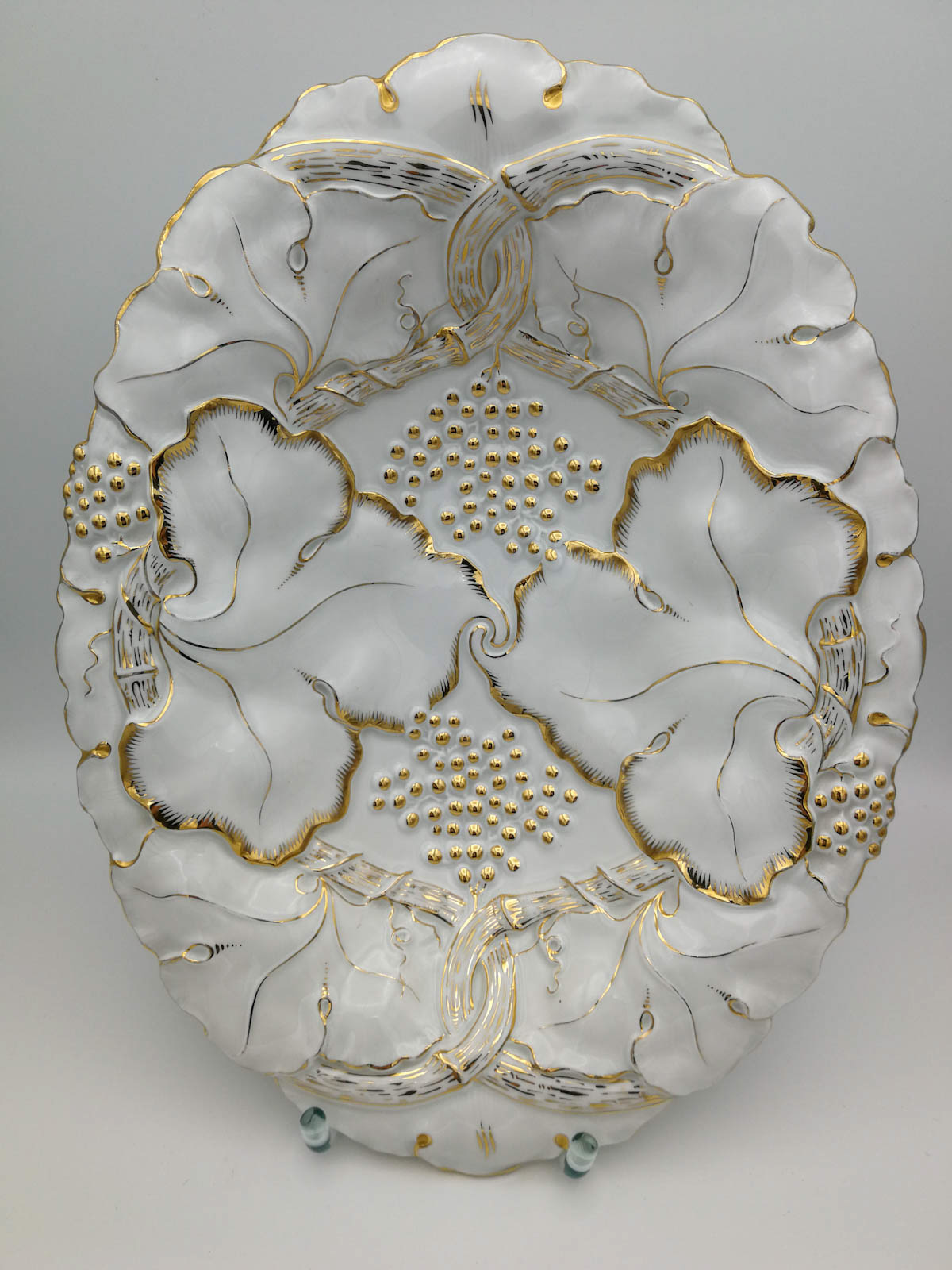 Vergoldetes Weinblatt Dekor auf ovaler Porzellanschale, von der sächsischen Manufaktur Meissen.