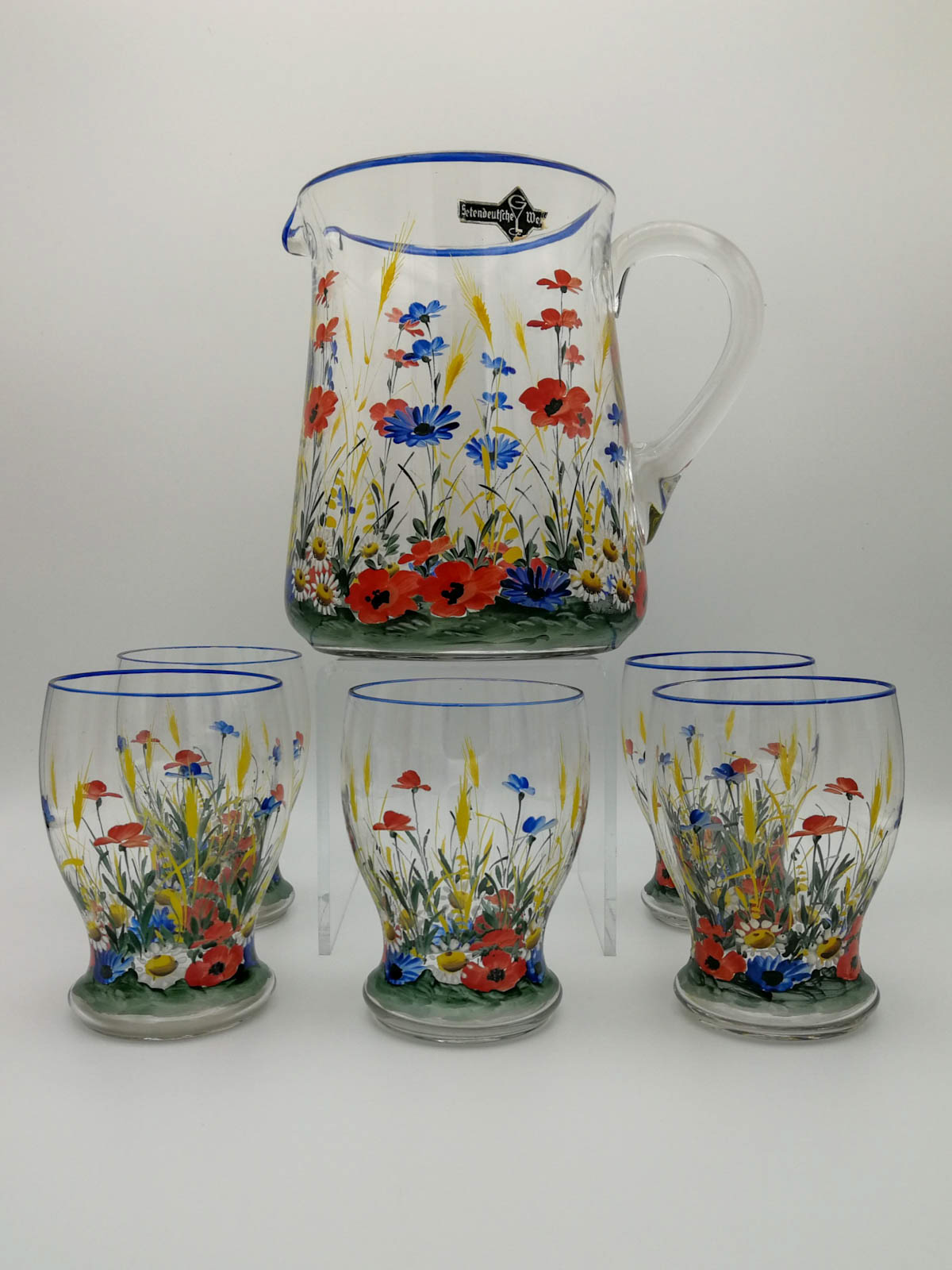 Bäuerlich anmutende Emaillemalerei auf Glaskrug und Bechergläsern.